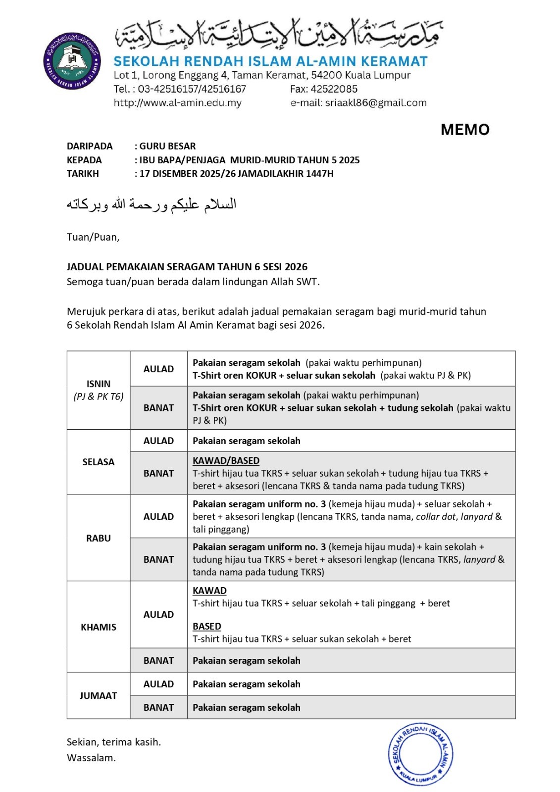JADUAL PEMAKAIAN SERAGAM - TAHUN 6